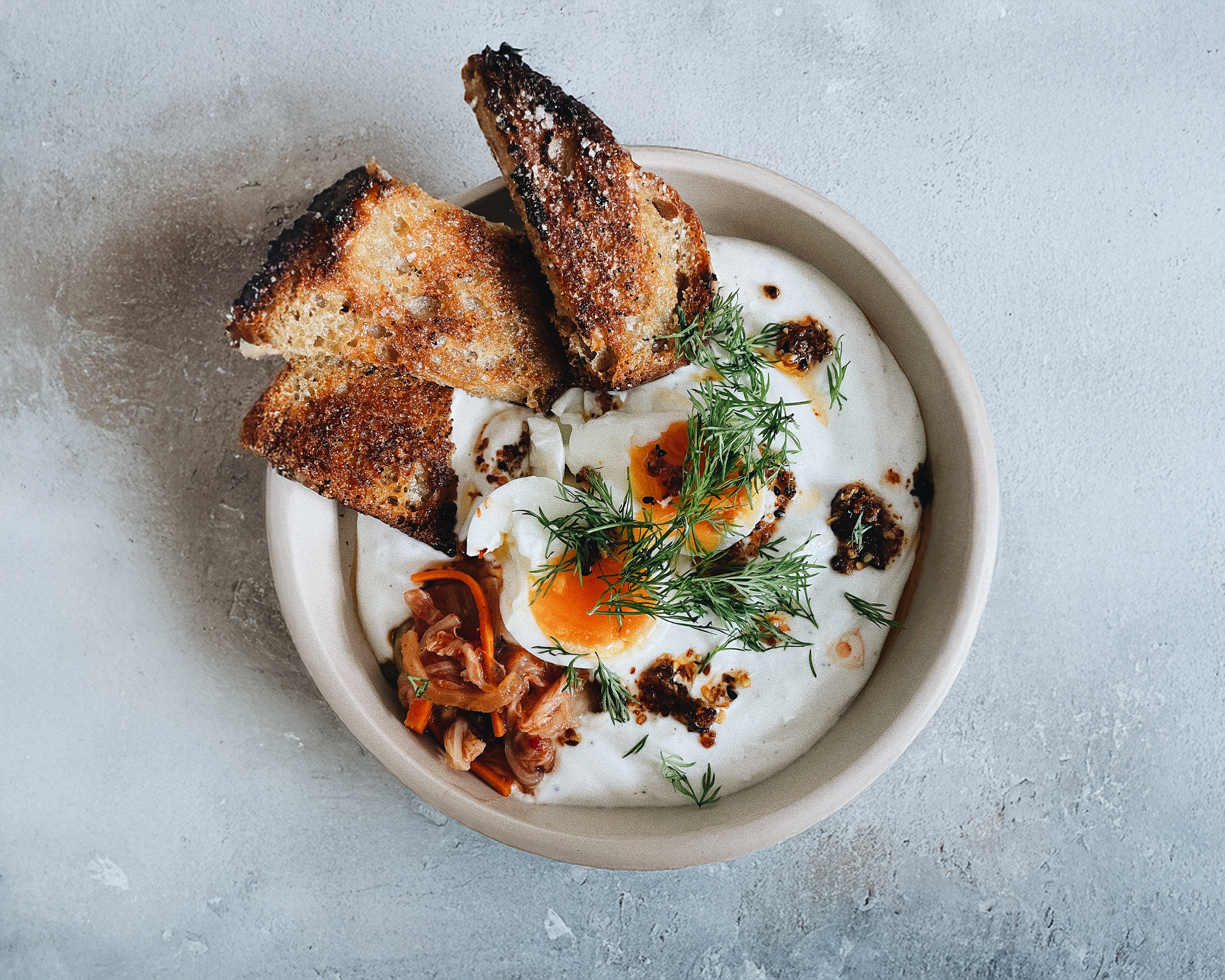 Spoon chilli crisp over the eggs. Sprinkle with more dill.